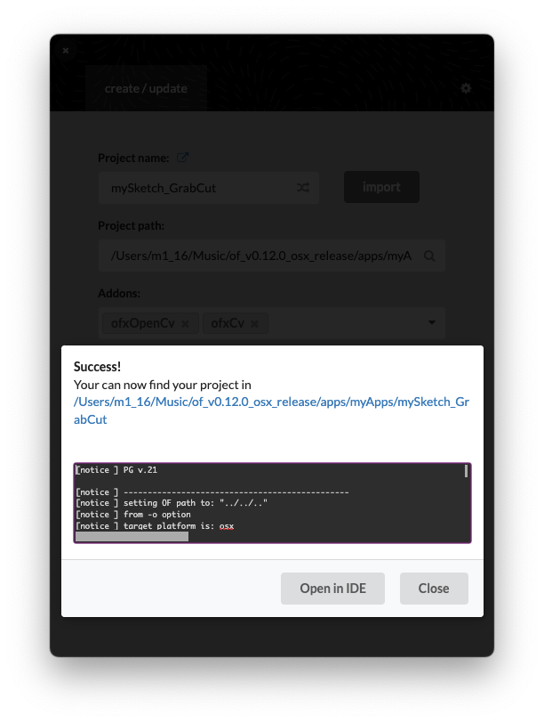 - 애드온은 파이썬에서의 패키지(라이브러리) 같은 겁니다. 여기선 영상처리를 위해 ofxOpenCV 와 ofxCv를 선택했네요. 둘 다 OpenCV라이브러리의 C++용 Wrapper인데, ofxCv 가 좀 더 고급진(?) 기능을 가지고 있습니다. 참고로 ofxOpenCV는 OF에 내장된 애드온이고 ofxCv는 써드파티로 추가로 설치해야 하는 애드온입니다.