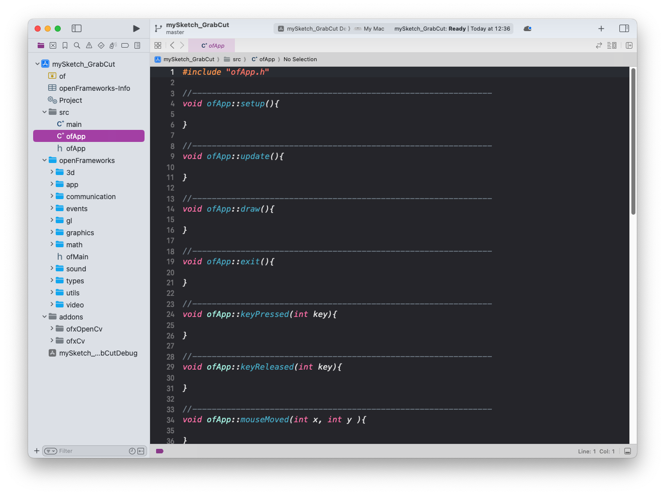 - 열린 Xcode 프로젝트는 main.cpp , ofApp.h, ofApp.cpp 3개의 파일로 구성됩니다. 우선 이건 헤더파일의 코드입니다. 앱클래스의 기본 메서드들의 프로토타입 들을 담고 있는데 setup(), update(), draw()가 핵심이고 나머지들은 다 이벤트 핸들러들입니다.